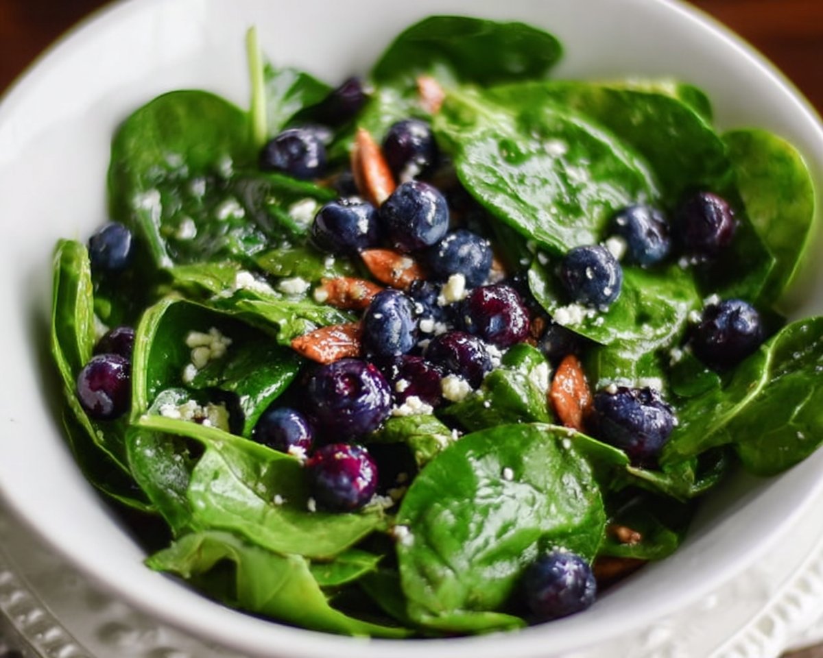 This Blueberry Spinach Salad is fresh, quick, and healthy. It mixes sweet berries with salty feta and crunchy nuts. The salad works as a light lunch or a side for dinner. If you like other berry salads, you might also enjoy a nutty version like the blueberry pistachio salad.